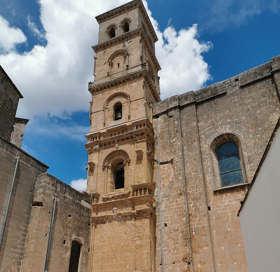 Afferente alla Chiesa Matrice, il campanile conta cinque piani, scanditi da monofore e mascheroni mitologici e zoomorfi, concepiti per scacciare il maligno. Una curiosa commistione tra fede e superstizione, non nuova in Salento.